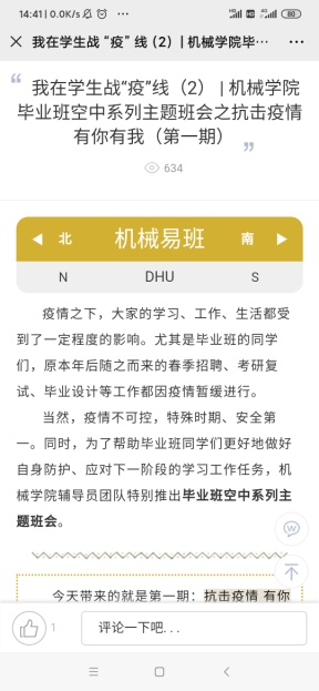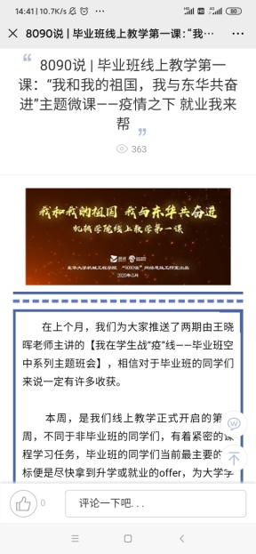 毕业班辅导员王晓晖老师积极利用易班平台发布“疫情之下,毕业班同学在行动”、“疫情之下,如何进行考研复试”、“疫情之下,就业我来帮”、“疫情当前,线上招聘面试需要注意哪些问题”等系列线上主题班会,坚守就业工作一线,确保就业工作不掉线、就业服务不打烊,坚决打赢就业攻坚战。