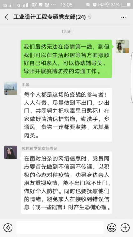 机械博士党支部史彬参与社区值班,协助居委会做好社区人员进出登记工作;机械183硕党支部刘建辉每天定期给电梯按钮消毒,降低社区人员使用电梯出现感染的风险;工业设计专硕党支部陈晓燕轮岗值班量体温,她表示:“全心全意为人民服务一直都是一名党员应该牢记在心的初心使命。尽管每天早晨5点多便起床上岗,但看着全国确诊病例不断下降,我越发觉得自己的辛苦是有价值的。”