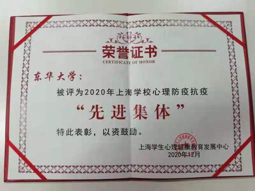 12月12日,上海学校心理防疫抗疫先进表彰暨上海高校心理健康教育与咨询中心(2021—2025)授牌仪在上海理工大学举行。会上对在心理防疫抗疫工作中做出突出贡献的高校进行表彰,我校获评“上海学校心理防疫抗疫先进集体”,并获示范中心授牌。