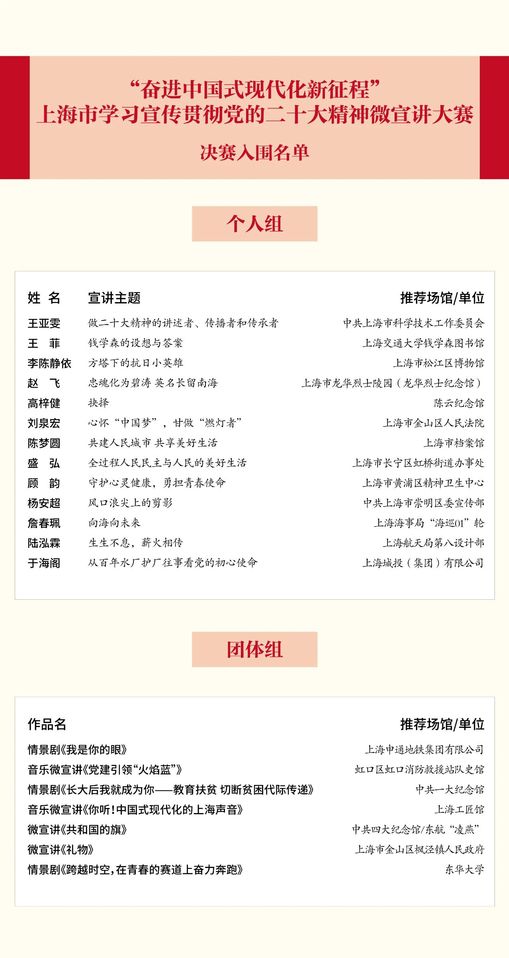 (上海市学习宣传贯彻党的二十大精神微宣讲大赛20强名单)