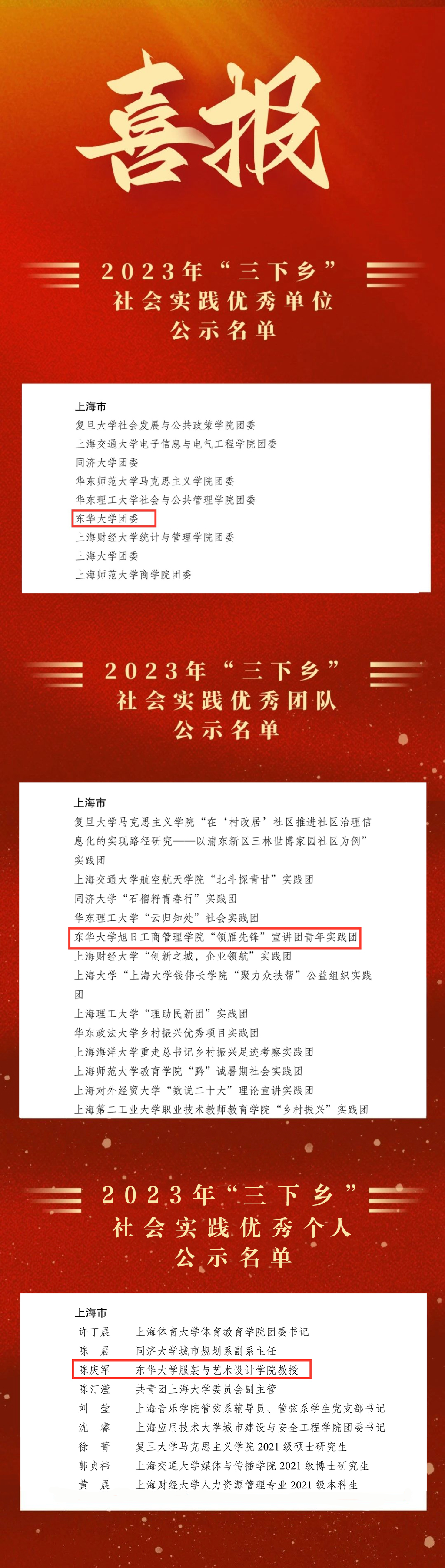 2023年,校团委以“强国有我,青春有为”为主题,分设“青春建功新时代”“人民城市新蓝图”“强国有我新青年”“砥砺奋进东华人”以及其他类实践专项等5个主题方向,组织441支团队、3300余名师生奔赴全国31个省、直辖市、自治区等开展社会实践活动,引导广大青年学生在社会实践中厚植家国情怀、了解国情民情、增长知识才干、激发挺膺担当。旭日工商管理学院“领雁先锋”宣讲团青年实践团以“初心‘申’起”和“领雁先锋飞行记”两大系列课程打造为实践主体内容,传播红色基因。实践团着力做好从宣讲课程打造到课程发布再到课程反馈的全过程调研实践,不断探索课程的数字化、多样化转型,进一步提升课程的灵动性与场景性,以“1+X”模式推动社会实践从寒暑期集中式向常态化转变,多元推进“领雁先锋”行走思政大课清单与实践育人大格局。服装与艺术设计学院陈庆军老师团队联合地方与全国高校发起“全国联合毕业设计”行动,围绕“论文写在大地,设计做在城乡”核心理念,以校地融合工坊为主要形式,近年共组织全国67所院校、300余名毕业生,在乡村现场实地开展联合毕业设计,通过“驻村毕设”“乡村答辩”等环节深入乡村振兴第一现场,在“高校导师+企业导师+村民导师”共同辅导下,实现专业知识创新向服务乡村振兴成果的积极转化,项目成果得到新华社、人民日报、光明日报等中央主流媒体专题报道。