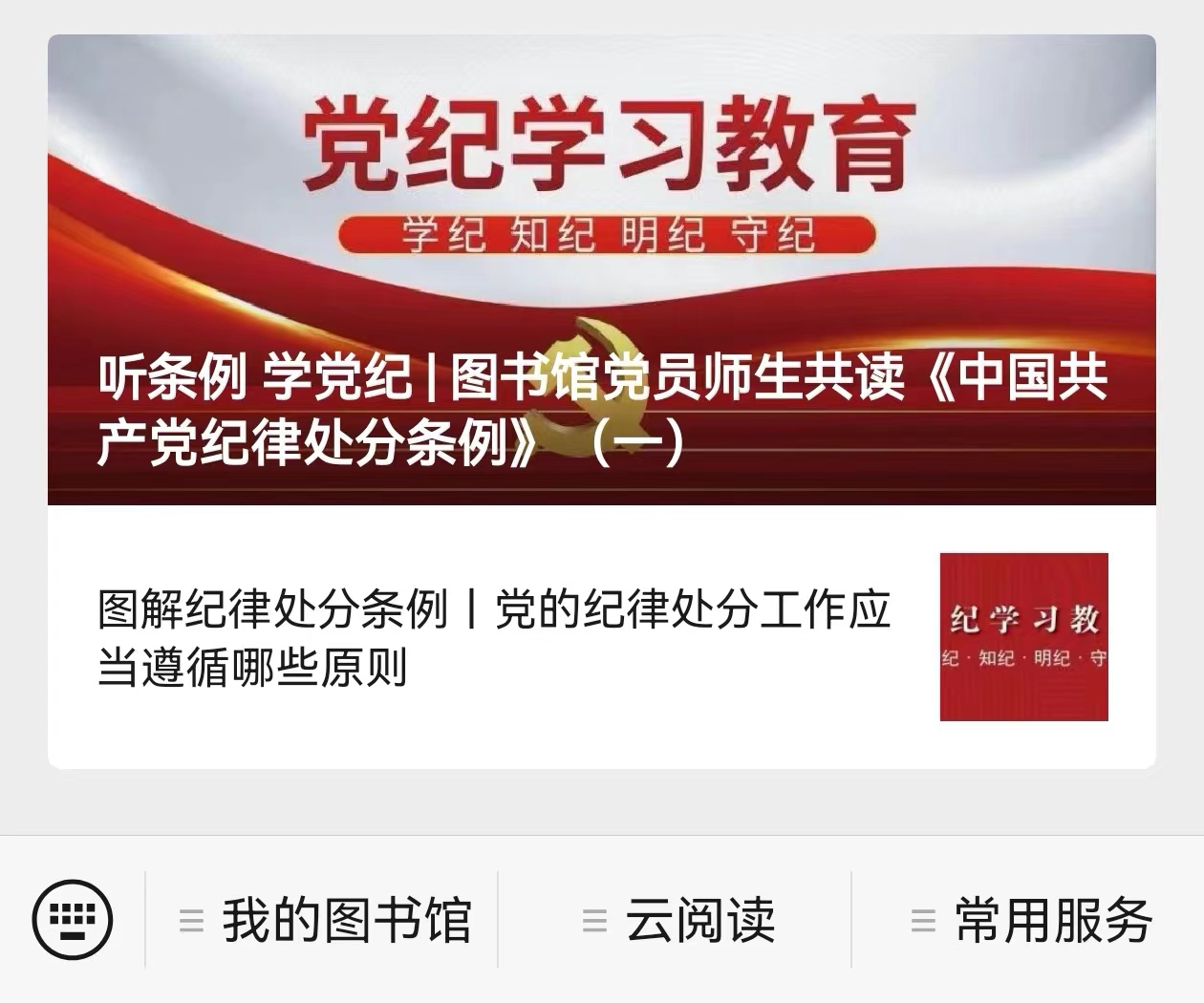 丰富载体、融入日常。在图书馆微信公众号开设“党纪学习教育”专区,推出“听条例 学党纪”专栏,图书馆教职工党员和爱书小蜜蜂服务队学生党员代表共读《中国共产党纪律处分条例》,同步在学习专区、党政联席会议群、支部群、部主任群转发权威解读文章,多形式多渠道推动《条例》入脑入心,做到党纪学习教育全覆盖,将遵规守纪内化为日用而不觉的言行准则。
