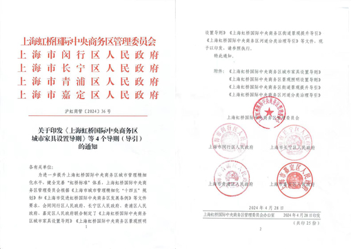 近日,我校环境艺术设计研究院受上海虹桥国际中央商务区管理委员会委托主编的《上海虹桥国际中央商务区城市家具设置导则》(以下简称《导则》),经上海虹桥国际中央商务区管理委员会、上海市闵行区人民政府、上海市长宁区人民政府、上海市青浦区人民政府、上海市嘉定区人民政府5部门联合批准发布实施。此《导则》依据国务院批复的《虹桥国际开放枢纽建设总体方案》和上海市政府印发的《上海市城市更新行动方案(2023-2025年)》等文件要求,进一步统一了虹桥商务区的规划建设标准,为打造国际化中央商务区、引领长三角一体化发展提供了保障。