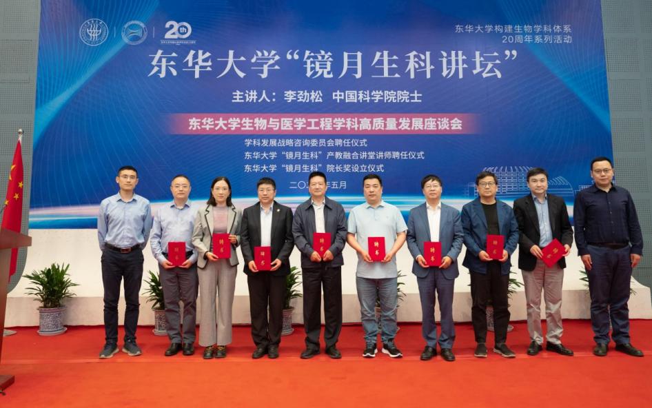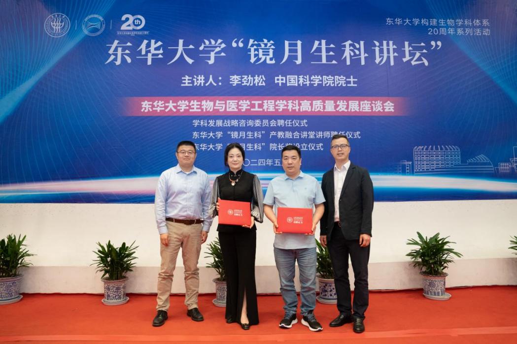 讲坛结束后,“镜月生科”院长奖(奖、助学金)设立仪式和产教融合讲堂讲师聘任仪式举行。东华大学教育发展基金会副理事长兼秘书长吴保根、学生处副处长黄朝阳为上海上青置业发展有限公司、浙江天纯创业投资有限公司颁发捐赠证书,教务处副处长李响、研究生院副院长丁明利为来自纽脉医疗、百多安医疗、昊海生科等企业专家颁发聘书。