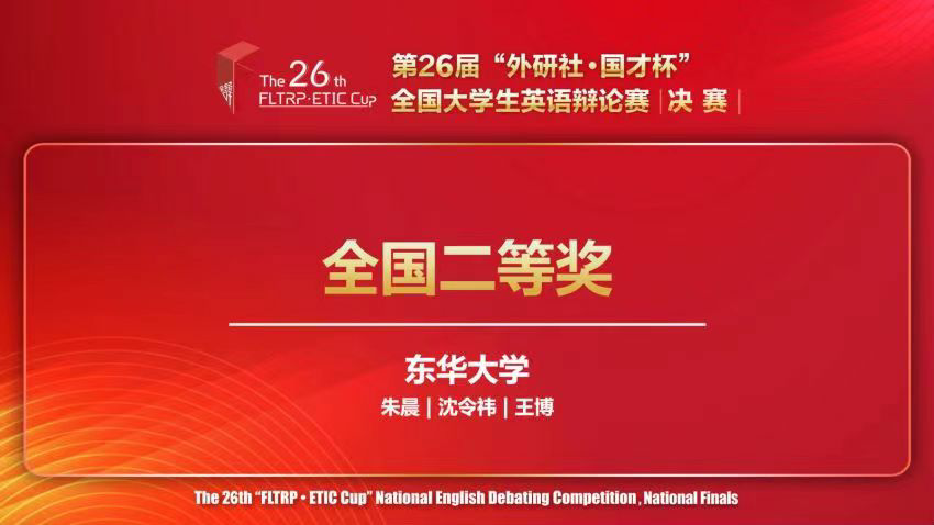 近日,第26届“外研社∙国才杯”全国大学生英语辩论赛圆满落幕。在指导老师朱晨带领下,外语学院英语翻译2101班沈令祎和23级学硕班王博,经过校园选拔赛和高强度集训,以华东地区复赛第一名的成绩闯入决赛。沈令祎和王博分别以第一名和第八名的成绩获得华东地区复赛“最佳辩手“称号。晋级国赛以后,两位同学组成的战队获得全国二等奖。