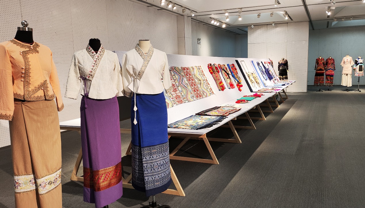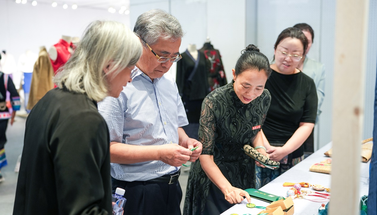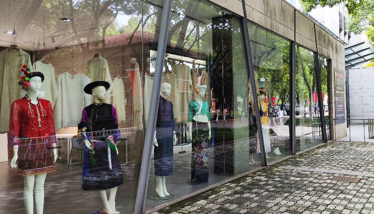 同期,“云裳申情”非遗成果静态展在我校延安路校区逸夫楼展厅和图书馆文化长廊展出。精心布置的展厅中呈现展品近400件,包括非遗学员从家乡带来的传统服饰、研培学习期间在老师指导下自己独立设计制作的民族服饰改良装以及系列文创产品。古老的非遗与时尚的文创之间既有间隔又有通联,用心倾听,还仿佛能听到古老服饰与现代时尚设计之间的对话。专程来为研修班授课的项兆伦观看静态展,并现场与学员交流了文化传承和创新设计的心得。
