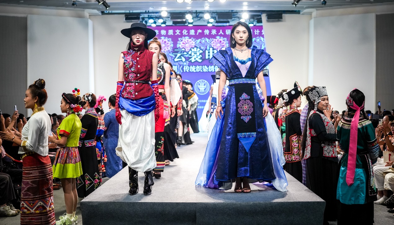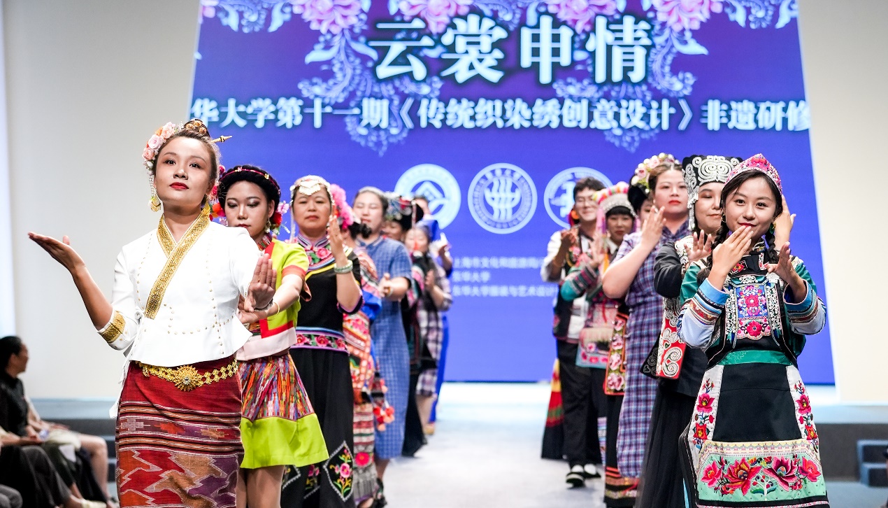 “云裳申情”动态秀上,由非遗教研中心张顺爱副教授全程指导、本期学员和结对中外学生共同设计制作的24套非遗元素创新设计时装生动亮相。此次24位非遗学员来自上海和云南两地,多年互帮互助结成的深厚情谊,也激发了学员们的创新设计潜力。参与结对的设计师学生中有12位来自东华大学服装与艺术设计学院、12位来自韩国汉阳大学和启明大学,研培计划让非遗传承人与中外设计新生代深入对接,培养了未来非遗传承的新生力量。