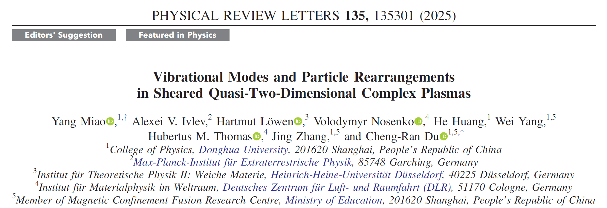 近日,物理学院杜诚然团队与德国马普学会地外物理研究所、杜塞尔多夫大学、德国宇航中心空间材料研究所合作,在准二维复杂等离子体振动模式与颗粒重排研究方面取得重要进展,成果发表于美国物理学会期刊《物理评论快报》(Physical Review Letters)并选为Editors’ Suggestion,学会旗下的Physics Magazine在Physics网站对相关工作进行了报道。我校硕士毕业生缪阳为论文第一作者,杜诚然研究员为论文通讯作者。