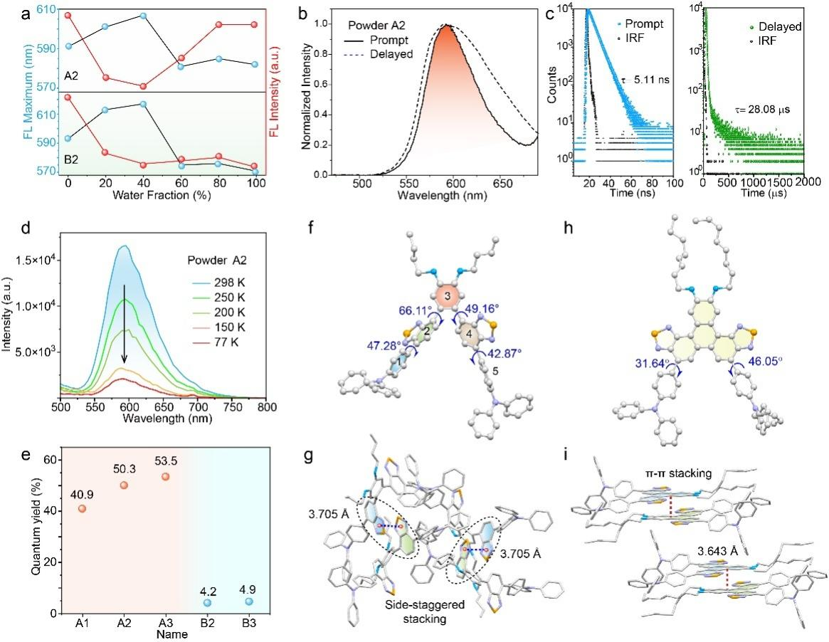 在聚集态中,特殊的V形结构和长烷基链使得这些发光分子保持了扭曲的构象和交错堆叠,从而有效抑制了不利于高效发光的分子间紧密面对面π-π堆积。此外,多重分子间相互作用也确保了这些分子具有明亮的聚集态TADF发光性能(图3)。