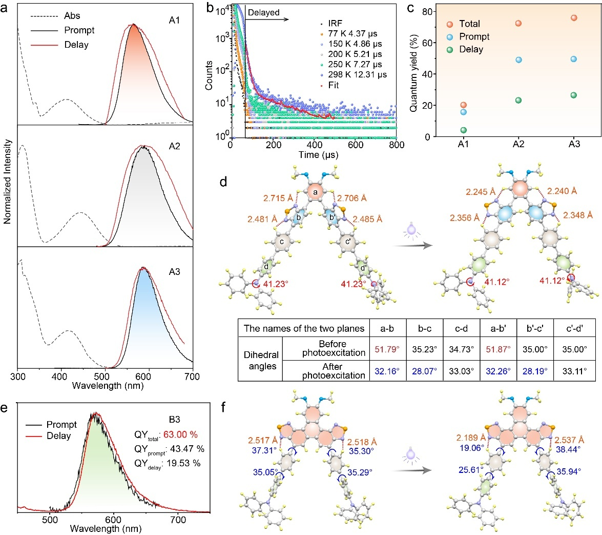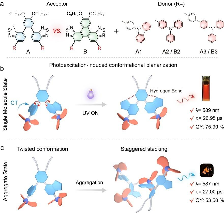 该系列分子在稀溶液中展现出明亮的橙红色发光。实验结果表明,邻位二取代的V形结构有效地整合分子内氢键和分子内电荷转移(ICT)效应。V形结构可促使形成多个分子内氢键,而ICT效应则显著松弛了激发态下的分子构象。在可见光激发下,该分子设计策略提高了分子构象的规整性,增强了溶液中分子的平面性,有效抑制了非辐射衰减过程,从而实现了溶液态的高效发光(图2)。