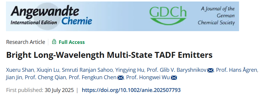 近期,我校化学与化工学院吴宏伟研究员和材料科学与工程学院陈丰坤研究员在多状态热激活延迟荧光分子体系研究方面取得进展,相关研究成果以《高效长波长多状态热激活延迟荧光分子体系的构建》(Bright Long‐Wavelength Multi‐State TADF Emitters)为题发表在国际化学类顶级期刊《德国应化》(Angewandte Chemie International Edition)。吴宏伟和陈丰坤为共同通讯作者,第一通讯单位为东华大学,文章第一作者为化工学院博士生单雪茹和材料学院博士生路秀芹。
