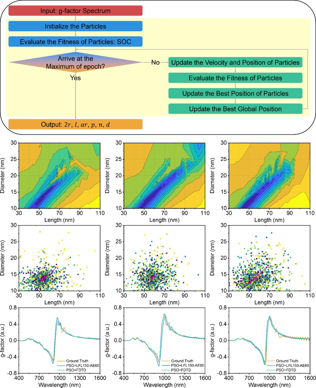 刘洋团队进一步将LFL150-AE60网络与粒子群算法结合,优化了用于反演金纳米棒螺旋结构形貌特征的PSO算法(图5)。升级后的PSO–LFL150-AE60算法具备更高的操作便捷性,仅需输入目标g-因子谱图,即可直接反演出对应的结构形貌参数。结果显示,基于该算法反演得到的结构参数所重建的g-因子谱图与输入目标高度一致。这一成果进一步巩固了PSO–LFL150-AE60算法在微结构逆向设计中的优势,为面向光学非对称性的微结构精准设计提供了可靠手段。