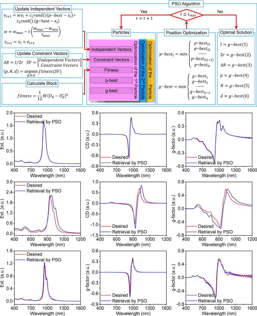 图3. 基于PSO算法反演结构特征参数的示意图,以及仿真结果与理论预期的对比。