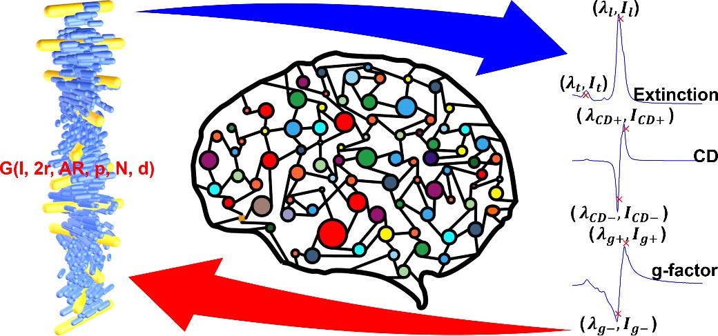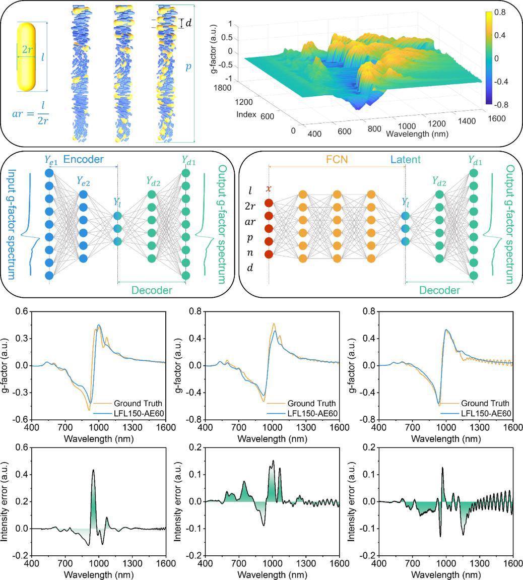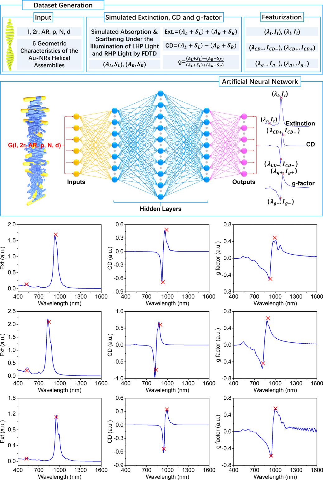 在前期工作中,刘洋聚焦于胆甾相液晶中金纳米棒螺旋扭曲微结构的构建,成功制备出具有光触发不对称可调谐特性的手性金纳米棒螺旋结构(Adv. Optical Mater. 2024,2400862)。随着研究深入,刘洋意识到,实现对该类微结构的高效“结构—性能”预测对实验研究具有重要指导意义。为此,刘洋指导硕士研究生陈永光、羊博等,基于时域有限差分法(Finite Difference Time Domain,FDTD)仿真自主构建了专用数据集,系统分析了金纳米棒螺旋结构特征与光学非对称性参数(如消光、圆二色谱及g-因子)之间的内在关联,分别开发了用于预测光学非对称性特征的神经网络,以及基于粒子群优化算法(PSO)的逆向结构反演方法。