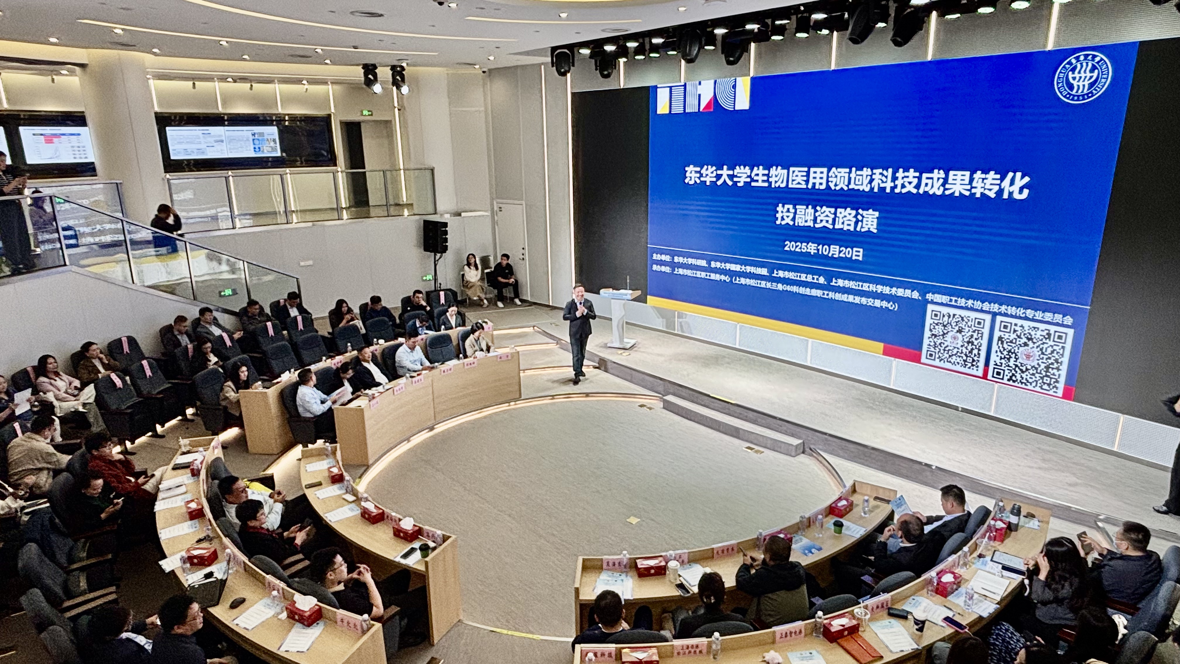 10月20日下午,东华大学生物医用领域科技成果转化投融资路演活动在松江区工人文化宫C馆下沉式交易中心举行。本次活动由我校科学技术研究院、国家大学科技园联合松江区总工会、区科委、中国职工技术协会转化专业委员会联合举办。我校生医、纺织、材料等相关学院共11个项目团队代表与会路演交流,邀请生物医药相关企业、投资机构、技术转移机构等单位80余人参会交流。