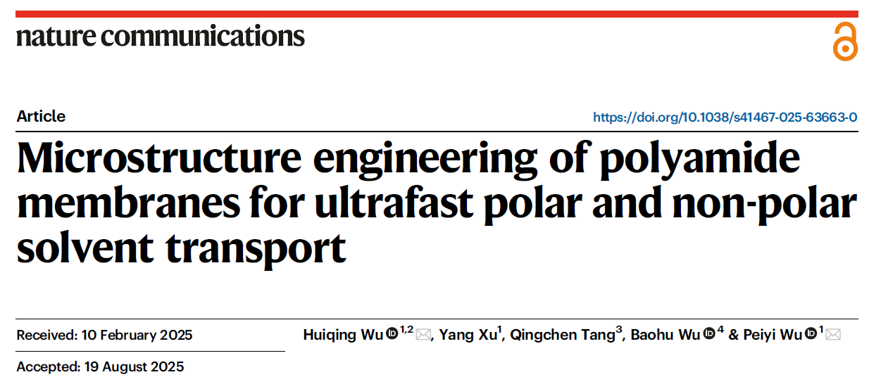 近期,化学与化工学院武培怡/吴慧青团队报道了一种“三合一”创新策略,旨在构建超薄微孔两亲性聚酰胺膜,同时实现超高的广谱溶剂渗透性和精细的分子筛分能力。相关研究成果以“《聚酰胺膜的微结构调控实现极性及非极性溶剂的超快传输》(Microstructure engineering of polyamide membranes for ultrafast polar and non-polar solvent transport)”为题,发表在《自然·通讯》(Nat. Commun. 2025, 16, 8414)。