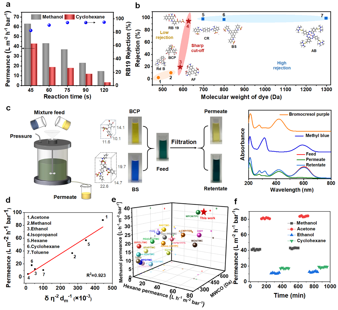 通过优化反应时间,可制备高交联度且超薄的聚酰胺分离膜,同时实现高通量和高截留。陡峭的截留曲线及MWRO和MWCO之间的极小差值证明了其高度均匀的孔结构和精确的分子筛分能力,能高效分离分子量相近的物质。膜对极性和非极性溶剂均展现出超高渗透通量,具有显著的性能优势。溶剂传输受粘度、溶剂-膜相互作用和空间位阻的共同影响。