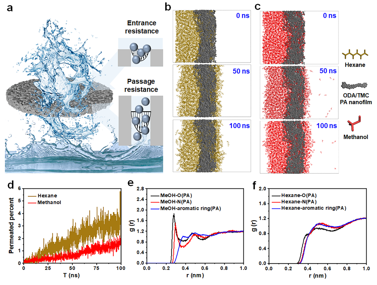 ODA/TMC膜中的溶剂传输是一个复杂过程,通过串联阻力模型理论模型和分子动力学模拟进行深入解析。利用Dagan模型分析发现,对于此类超薄致密膜,虽然孔道内部阻力占主导,但入口阻力的影响不容忽视。Lucas-Washburn方程则揭示了正向的毛细管驱动力可降低膜的溶剂分子入口阻力,提升传输效率。模拟结果显示正己烷在膜中的传输速率快于甲醇,与实验测试结果一致。