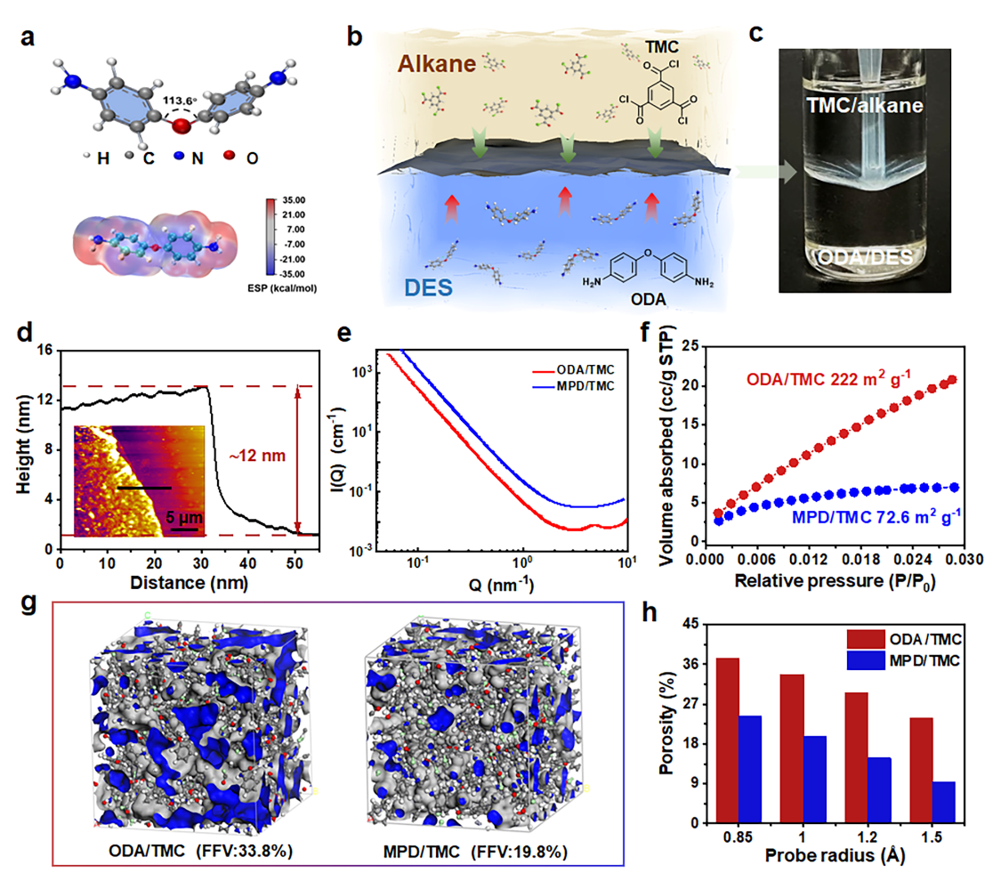 该策略主要包含三个核心点:1)单体分子设计:采用带有二苯醚基团的二胺单体,在聚酰胺层中构建亲水/疏水平衡的两亲结构,形成分别利于极性和非极性溶剂传输的类双通道,实现广谱溶剂的高效渗透。2)聚合物结构优化:在聚酰胺网络中引入非平面扭曲结构,增强膜的微孔性和孔道互联性,显著提升溶剂渗透率。3)界面聚合过程调控:使用低共熔溶剂替代水作为反应介质,不仅允许非水溶性胺单体的使用,且能通过调制低共熔溶剂的组成及性质来精细调节界面性质和反应环境,实现对界面聚合过程的有效控制。