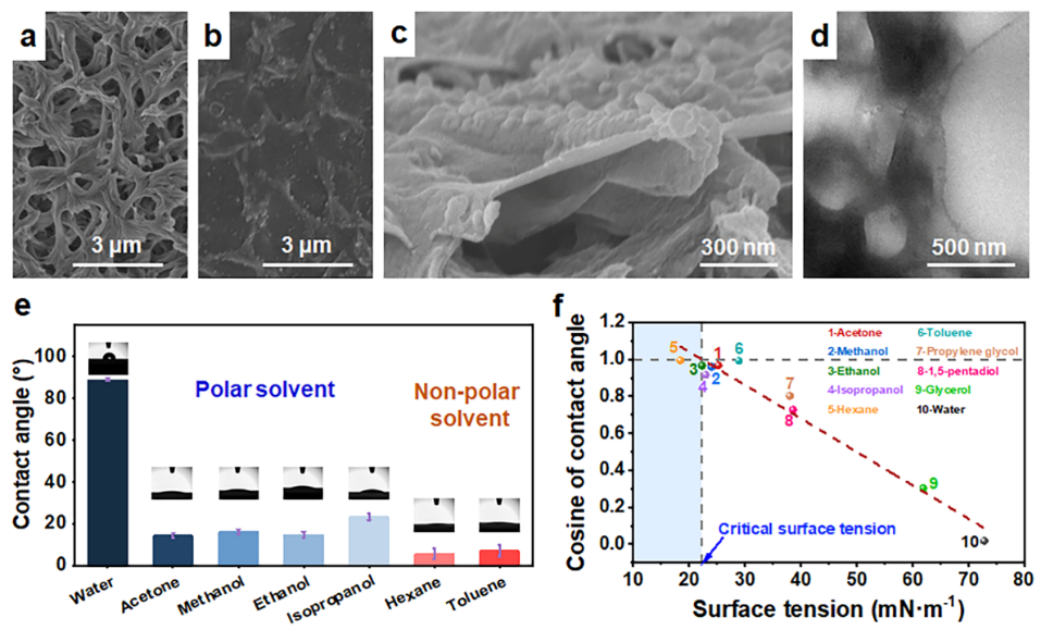 在尼龙基底上可原位界面聚合形成致密无缺陷的聚酰胺复合膜。膜表面对有机溶剂展现出极高的亲和性,对极性溶剂接触角<25°,对非极性溶剂尤其低(<10°)。临界表面张力极低,表面张力低于此值的溶剂均能完全润湿该膜,产生促进液体传输的正向毛细管力。