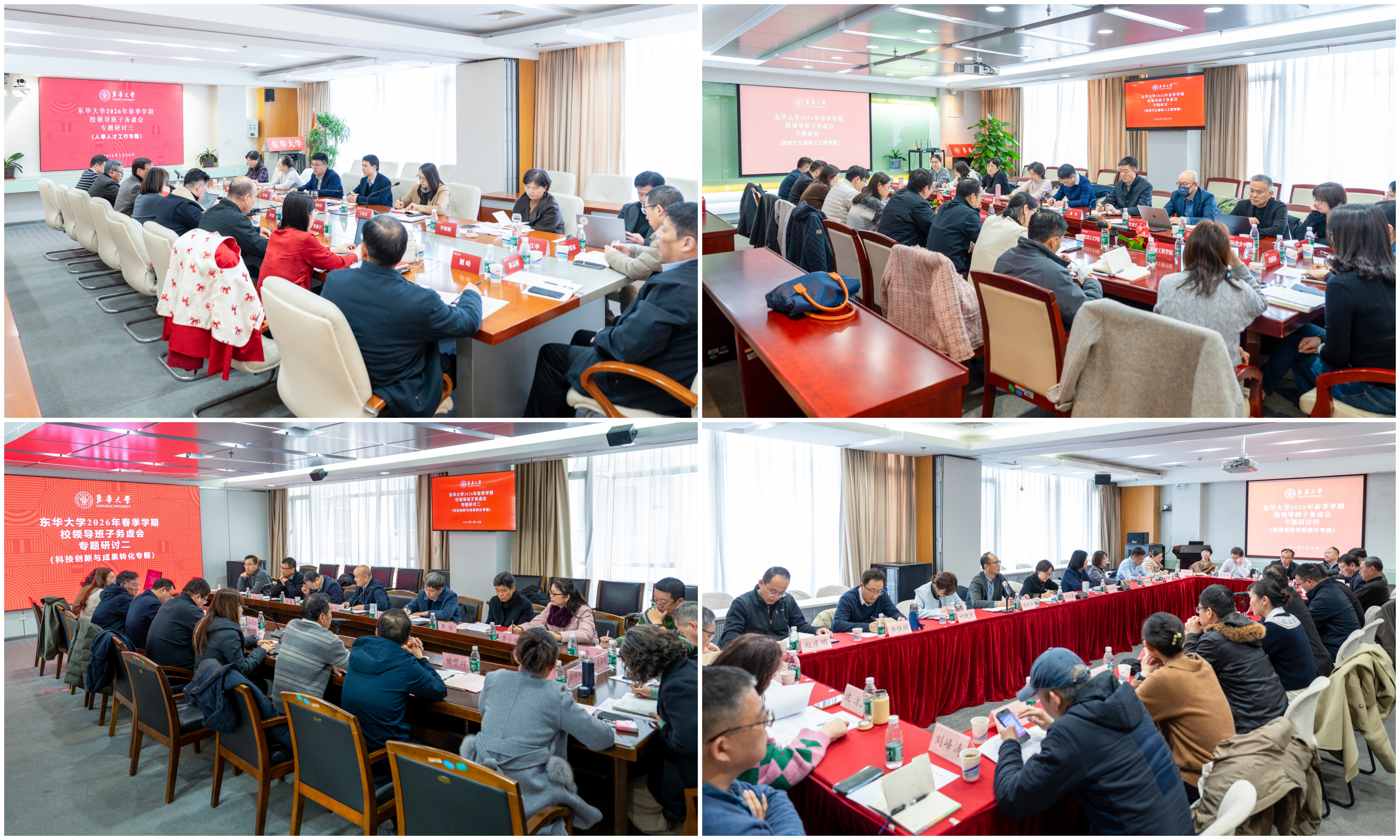全体与会同志还围绕新时代立德树人工程、科技创新与成果转化、人事人才工作、管理服务效能提升4个专题开展分组交流研讨,大家充分交流真知灼见、共同破解发展难题,进一步凝聚了发展共识。党委宣传部、科研院、人事处、发展规划处在会上作重点发言,立足各自部门实际汇报进展、建言献策、细化落实,为学校改革发展提供坚实保障。