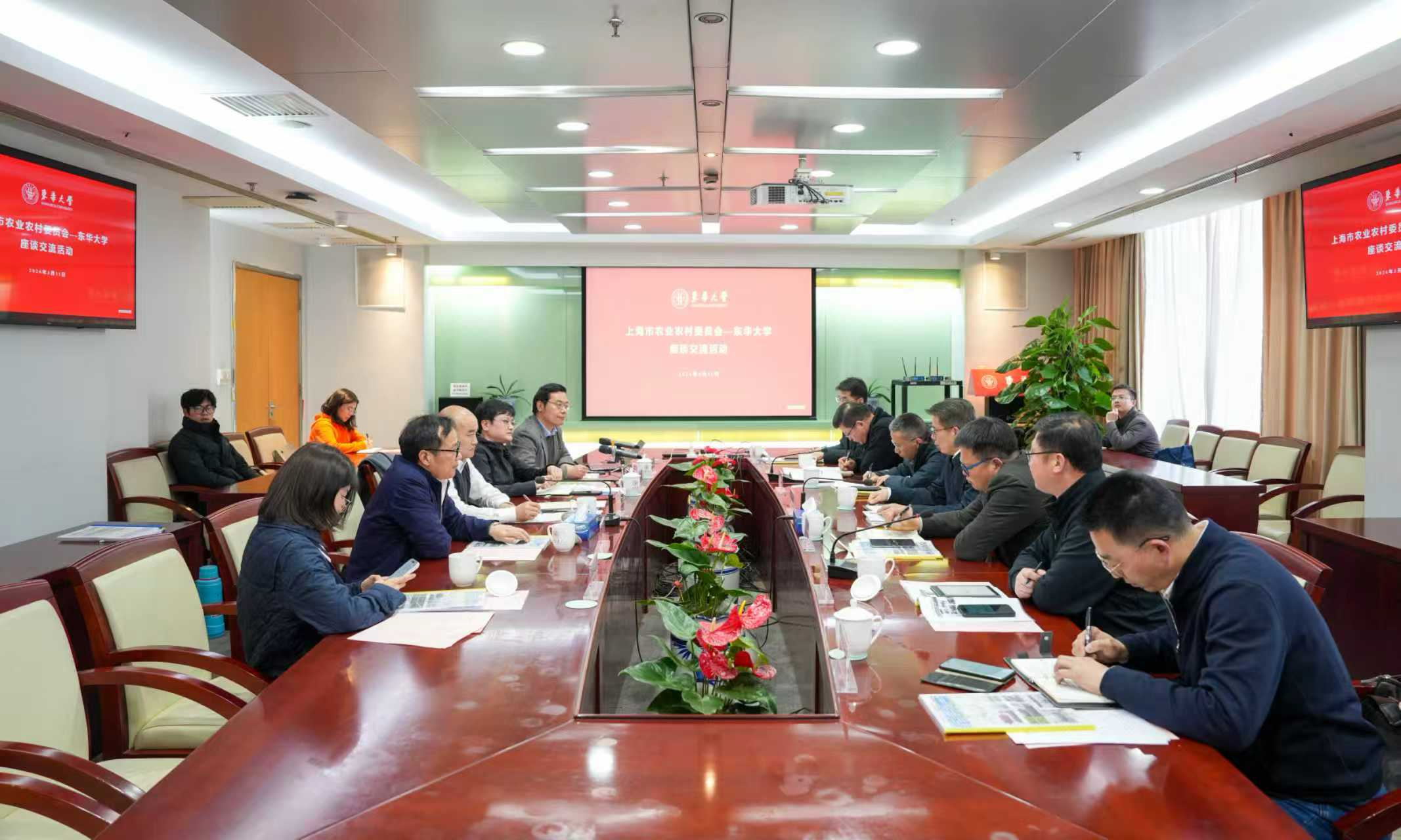 上海市农业农村委员会畜牧兽医管理处、种植业管理处、科学技术处、办公室、市农业科技服务中心、市农业发展促进中心相关负责人,与我校产学研合作处、环境科学与工程学院相关负责人及教师代表参加座谈。