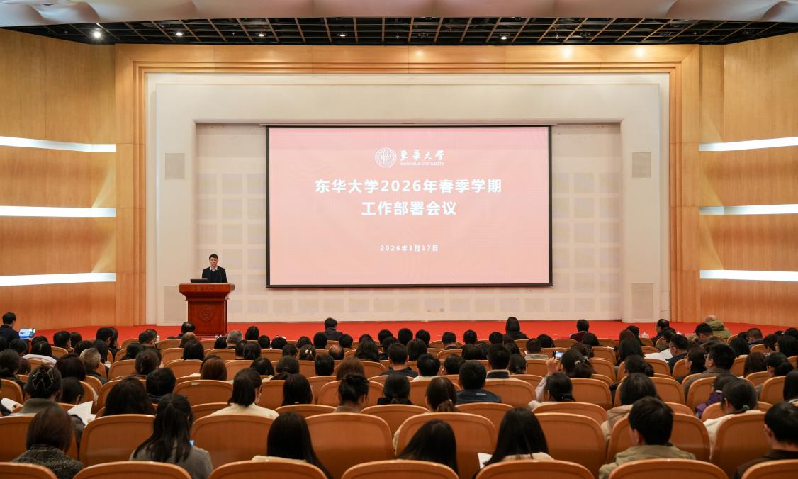 3月17日,学校在松江校区召开2026年春季学期工作部署会。会议强调,坚持以习近平新时代中国特色社会主义思想为指导,深入贯彻党的二十大和二十届历次全会精神,全面落实习近平总书记关于教育的重要论述和全国教育大会精神,牢牢把握教育的政治属性、人民属性、战略属性,全面落实立德树人根本任务,突出“重服务、强贡献”导向,持续推进教育科技人才一体发展,深入实施学校深化综合改革三年行动方案,高质量编制实施学校“十五五”规划,牢固树立和践行正确政绩观,团结带领广大党员和全体师生员工锚定发展目标,昂扬攻坚精神,全面深化改革,以实干实效确保学校“十五五”开好局、起好步。