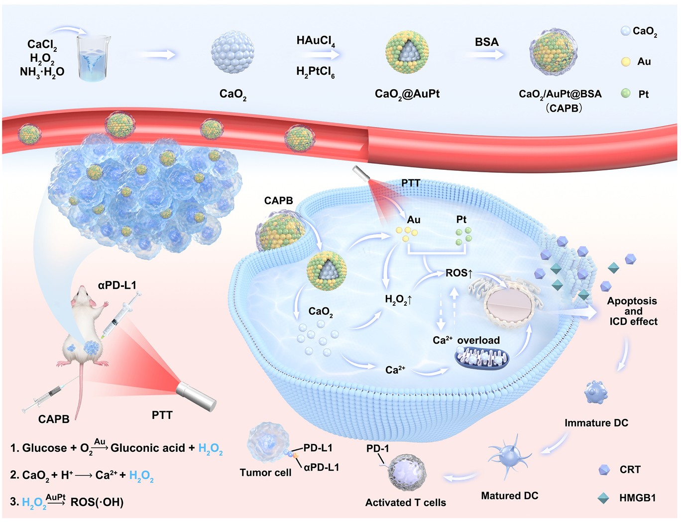 基于纳米酶的化学动力学治疗(CDT),凭借安全性高、无需外源供氧、可调控肿瘤微环境等优势,近年来成为肿瘤治疗领域的研究热点。该疗法依托Fenton/类Fenton反应,将肿瘤内源性H₂O₂转化为高毒性ROS杀伤肿瘤细胞,但临床转化面临两大核心瓶颈:一是纳米酶催化活性不足,二是肿瘤微环境H₂O₂浓度极低(仅50-100×10⁻⁶ M),难以生成足量ROS。此外,单一治疗模式无法彻底清除肿瘤、遏制复发转移,严重限制临床应用。因此,构建高效自供H₂O₂纳米酶体系、整合多模式协同治疗,成为肿瘤纳米医学领域的关键研究方向。针对上述难题,科研团队依托医工交叉开展攻关,研发出基于过氧化钙(CaO₂)的AuPt双金属自级联纳米酶体系CaO₂/AuPt@BSA(CAPB),实现化学动力学、光热、免疫三重协同抗肿瘤治疗。论文通讯作者为权静、孙鹏,共同第一作者包括生物与医学工程学院研究生刘文涛、朱丽丽。