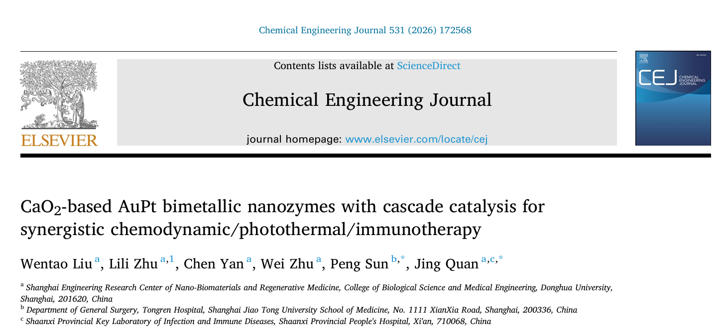 近日,生物与医学工程学院权静副教授团队联合上海交通大学医学院附属同仁医院孙鹏主任团队,以“基于CaO₂的AuPt双金属纳米酶级联催化用于协同化学动力学/光热/免疫治疗”(CaO₂-based AuPt Bimetallic Nanozymes with Cascade Catalysis for Synergistic Chemodynamic/Photothermal/Immunotherapy)为题,在《化学工程杂志》(Chemical Engineering Journal)上发表研究成果,为肿瘤治疗提供全新方案。