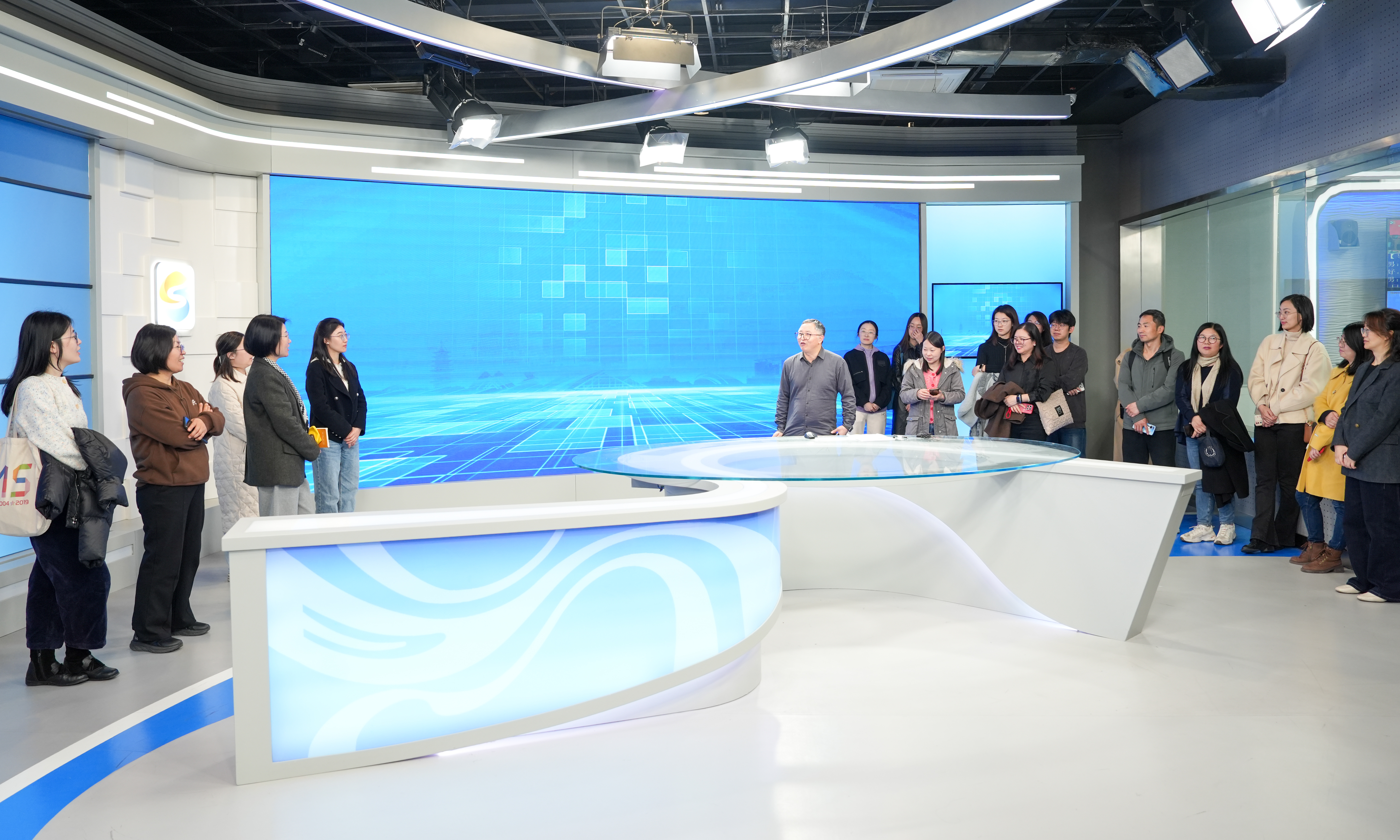 实践学习环节,参训人员赴松江区融媒体中心开展现场研学。松江区融媒体中心主任周样波带领大家参观并讲解融媒体指挥中心、新闻演播室、广播电台直播间等,参训人员学习了融媒体时代内容生产流程的创新机制与实践经验。在座谈交流环节,与会双方交流探讨了智媒融合、新闻素养、校媒合作等议题。
