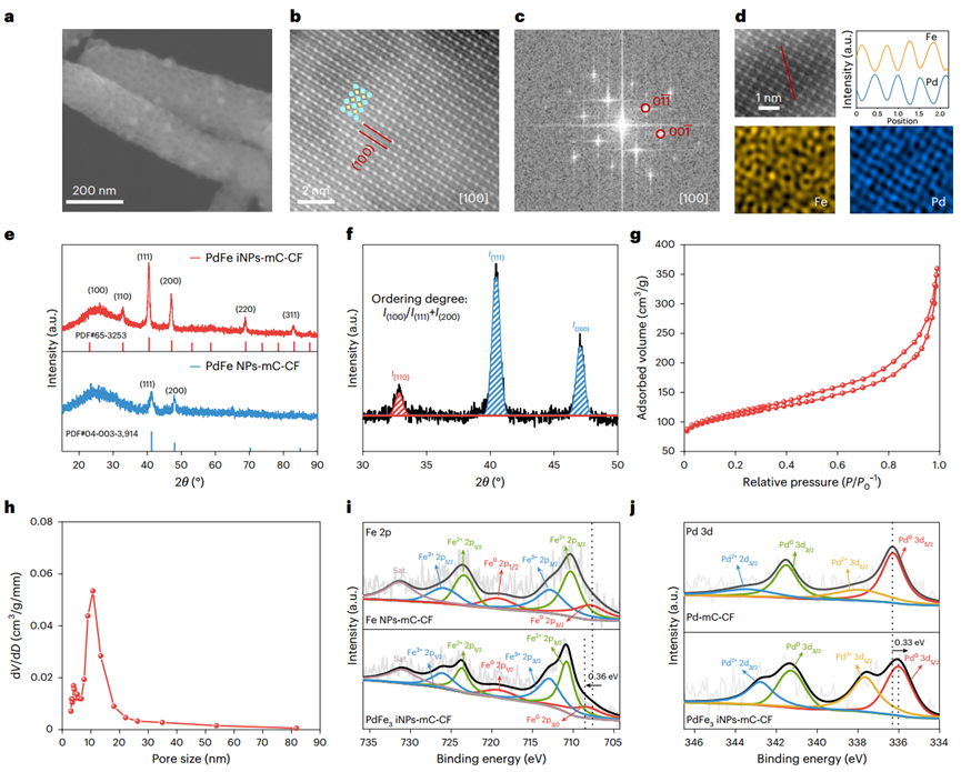 图4 PdFeiNPs-mC-CF的详细表征。a.SEM图像(比例尺,200 nm)。b、c. 原子分辨率HAADF-STEM图像及沿[100]晶带轴对应的FFT花样(比例尺,2 nm)。d. 放大的原子分辨率HAADF-STEM图像、沿红线的柱强度及相应原子尺度EDS元素面扫(比例尺,1 nm)。e. 有序PdFe iNPs-mC-CF与无序PdFe NPs-mC-CF的XRD对比图谱。f. (110)有序峰与(111)、(200)主峰的峰面积定量评估。g. 氮气吸脱附等温线。h. 孔径分布分析。i.Pd 3d核心能级的高分辨XPS谱。j. Fe 2p核心能级的高分辨XPS谱。 © 2026 Nature Protocols