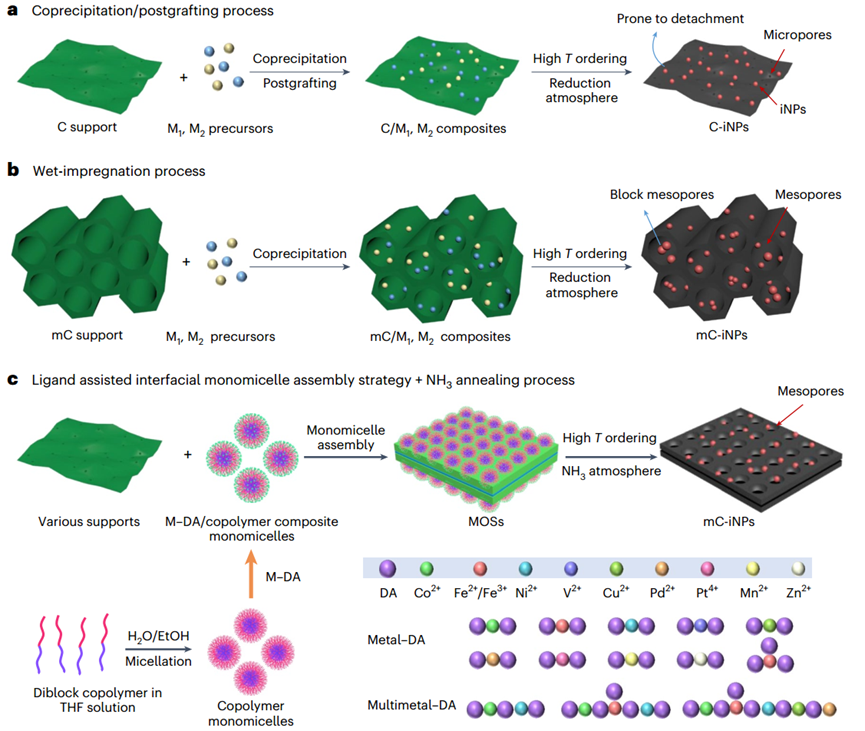 图1 将iNPs负载到碳载体上的不同合成方法示意图。a. 共沉淀/后接枝过程,随后进行高温还原处理。b.湿法浸渍过程,先制备介孔碳载体,再通过真空过滤或表面功能化将金属前驱体引入介孔中。c. 配体辅助界面单胶束组装策略,随后进行NH₃退火处理(以二维碳载体上的单胶束组装为例)。 © 2026 Nature Protocols