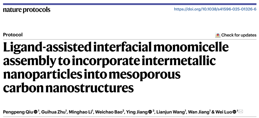 针对以上需求,近日,东华大学先进纤维材料全国重点实验室、材料科学与工程学院罗维、邱鹏鹏团队发展了一种极具普适性和可控性的“配体辅助界面单胶束组装-氨气碳化”策略,成功实现了金属间纳米颗粒(intermetallicnanoparticles,iNPs)在介孔碳(mesoporous carbon,mC)载体中的原位组装。相关成果以《配体辅助界面单胶束组装策略将金属间化合物纳米粒子精准引入有序介孔碳纳米结构》(Ligand-assisted interfacial monomicelle assembly to incorporate intermetallic nanoparticles into mesoporous carbon nanostructures)为题发表在《自然 实验手册》(Nature Protocols)期刊。该方法利用金属-多巴胺-嵌段共聚物复合单胶束作为构筑单元,通过一步热处理同步实现了金属原子的有序化、碳骨架的介孔化以及iNPs在介孔孔壁的原位锚定,有效解决了传统方法中iNPs易团聚、尺寸分布不均、与载体相互作用弱等问题。该策略实现了对iNPs成分(从二元到八元)、原子有序度(0-95%)和晶相(如L1₀, L1₂)的精确调控,并可适配于零维、一维和二维等多种形貌的碳载体。