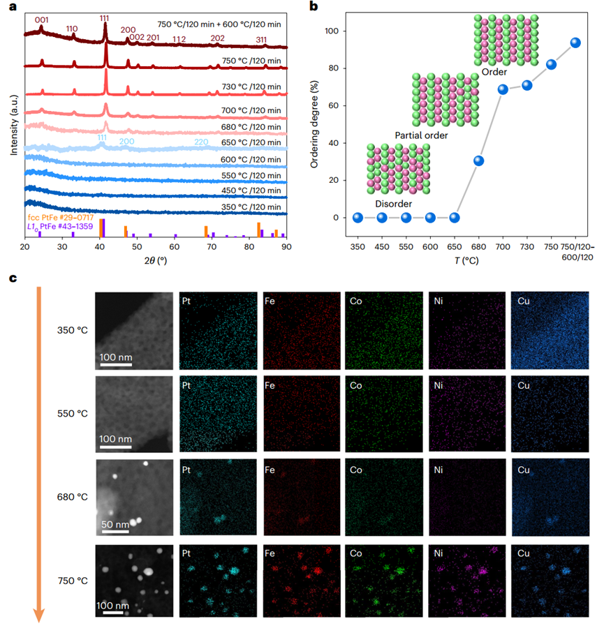 退火温度对iNPs有序度的影响:XRD分析显示,低于600℃时仅为无定形金属簇;650℃时出现无序面心立方PtFe相;680℃以上开始出现L1₀有序相的特征衍射峰(24.2°和33.4°)。温度从680℃升至750℃,有序度从30.5%提升至82.1%。若采用两步NH₃退火(750℃/120 min后650℃/120 min),有序度可达93.8%。暗场STEM及元素分布图证实,即使在高温下各金属元素仍保持均匀分布。