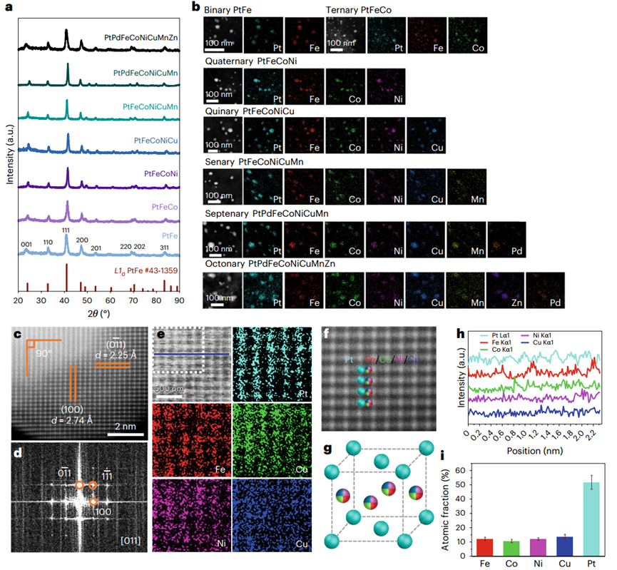 图3 从二元到八元的Pt基iNPs-mC-GO的表征。a. XRD图谱。b. 暗场STEM图像及相应的元素分布图(比例尺,50 nm)。c-i. 五元PtFeCoNiCuiNPs-mC-GO样品的表征:c.原子级HAADF-STEM图像(比例尺,1 nm),d. 沿[011]晶带轴对应的FFT花样,e. 原子级HAADF-STEM图像及相应元素分布图(比例尺,1 nm),f. 叠加在HAADF图像上的晶格位点元素分布示意图,g. 模拟原子结构示意图,h. 沿f图中红线的柱强度,i. 各元素原子分数。 © 2026 Nature Protocols
