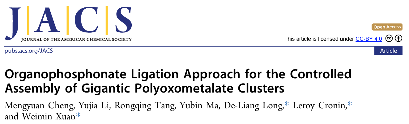 近日,化学与化工学院宣为民特聘研究员课题组在高核多金属氧簇(Polyoxometalates)的可控组装领域获新进展。相关研究成果以《有机膦酸配位策略用于巨型多金属氧簇的可控组装》(Organophosphonate Ligation Approach for the Controlled Assembly of Gigantic Polyoxometalate Clusters)为题,发表在国际化学领域顶级期刊《美国化学会志》(Journal of the American Chemical Society, JACS)上。