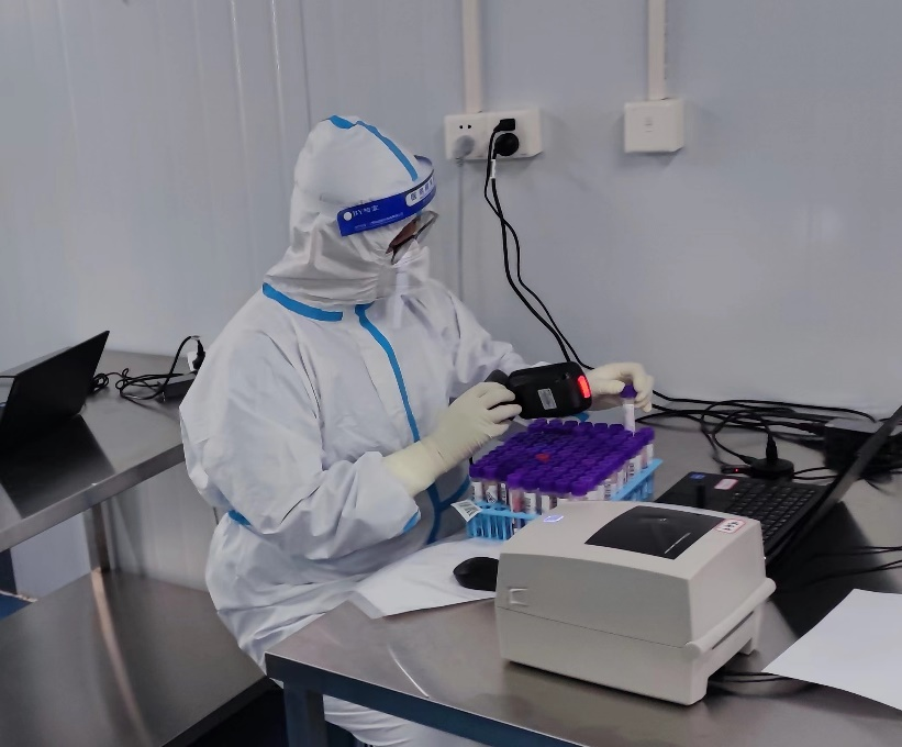走进东华大学PCR方舱实验室,就可以见证一份准确的核酸报告是如何通过“三步走”诞生的。先编号,打印标签;再扫描,录入系统——第一步,在样品接收房里,检验人员正为刚刚送到的样本进行逐一编号和信息录入。